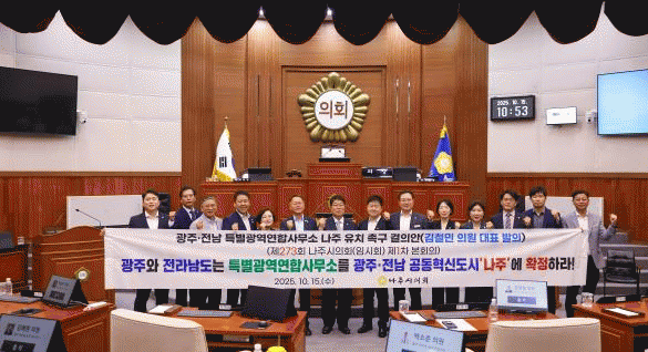 ³ªÁÖ½ÃÀÇȸ´Â À̹ø °ÇÀǾÈÀ» ÅëÇØ ¡ã±¤ÁÖ¡¤Àü³² Ưº°±¤¿ª¿¬ÇÕ ±Ô¾à¿¡ »ç¹«¼Ò ¼ÒÀçÁö¸¦ ¸í½ÃÀûÀ¸·Î ±¤ÁÖ¡¤Àü³² °øµ¿Çõ½Åµµ½Ã(³ªÁֽà ºû°¡¶÷µ¿)À¸·Î È®Á¤ÇÒ °Í°ú ¡ãÈļÓÇùÀÇ Àü °úÁ¤¿¡¼ »ó¡¼º¡¤Á¤ÇÕ¼º¡¤°Å¹ö³Í½º Á¢±Ù¼ºÀ» °¡»ê¿ä¼Ò·Î ¸í¹®ÈÇϰí, ´Ù¸¥ Çö¾È°úÀÇ Á¤Ä¡Àû ±³È¯¡¤°Å·¡¸¦ ÀÏü ¹èÁ¦ÇÒ °Í, ¡ãÁ¤ºÎ¡¤±¤Áֽá¤Àü³²µµ´Â ³ªÁÖ À¯Ä¡¿¡ ÇÊ¿äÇÑ ÀÎÇÁ¶ó¿Í ¿¹»êÀ» Á¶¼ÓÈ÷ È®Á¤Çϰí, ¿¬ÇÕ Ãâ¹ü ÀÏÁ¤°ú ¿¬µ¿ÇØ ÇàÁ¤ °ø¹é ¾øÀÌ ÁýÇà °èȹÀ» Á¦½ÃÇÒ °ÍÀ» Ã˱¸Çß´Ù.