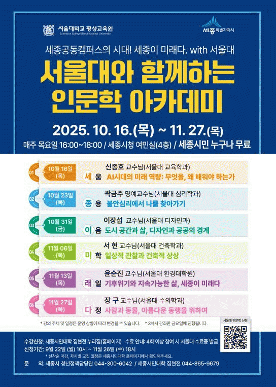 ¼¿ï´ëÇб³ Àι®ÇÐ ¾ÆÄ«µ¥¹Ì´Â ¿À´Â 11¿ù 27ÀϱîÁö ¸ÅÁÖ ¸ñ¿äÀÏ(3Â÷½Ã¸¸ ±Ý¿äÀÏ) ¿ÀÈÄ 4½ÃºÎÅÍ 6½Ã±îÁö ¼¼Á¾½Ãû ¿©¹Î½Ç¿¡¼ ¹Ì·¡±³À°, öÇÐ, »çȸ, ȯ°æ µî ´Ù¾çÇÑ ÁÖÁ¦·Î ÃÑ 6ȸ¿¡ °ÉÃÄ ¿î¿µµÈ´Ù.