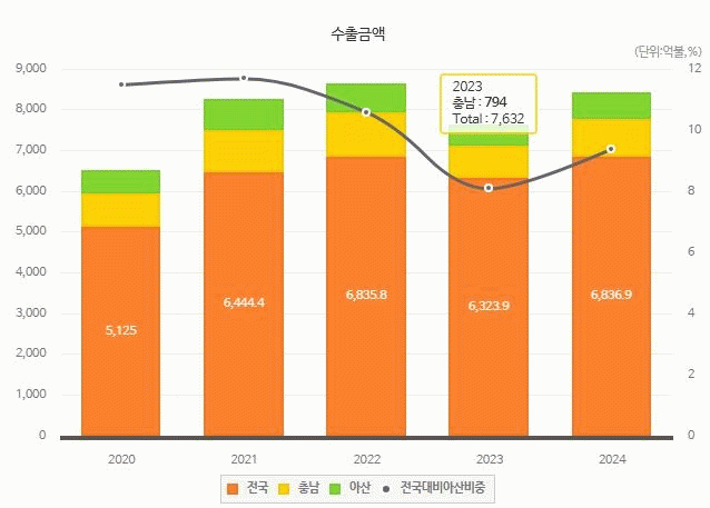 ¼öÃâ¾×Àº 2015³â 463¾ï ´Þ·¯¿¡¼ 2024³â 645¾ï ´Þ·¯·Î Áõ°¡Çß´Ù. Àü±¹ÀÇ 9.4%, Ãæ³²ÀÇ 69.7%¿¡ ´ÞÇÏ´Â ±Ô¸ð´Ù. Áö¿ª³»ÃÑ»ý»ê(GRDP) ¶ÇÇÑ 2015³â 27Á¶ ¿ø¿¡¼ 2022³â 37Á¶ ¿øÀ¸·Î ´Ã¸ç Ãæ³²µµ ³» 1À§ÀÌÀÚ, 26.7%¸¦ Â÷ÁöÇϰí ÀÖ´Ù.