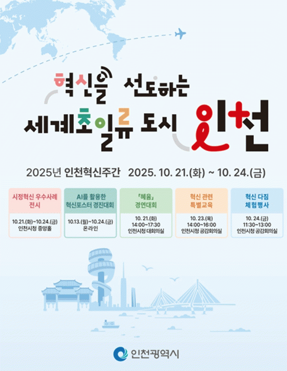 À̹ø Çõ½ÅÁÖ°£Àº ¡®Çõ½ÅÀ» ¼±µµÇÏ´Â ¼¼°è ÃÊÀÏ·ùµµ½Ã ÀÎõ¡¯À» ÁÖÁ¦·Î ÀÎõ½Ã°¡ ÃßÁøÇØ ¿Â ÁÖ¿ä Çõ½Å ¼º°ú¸¦ ½Ã¹Î°ú °øÀ¯Çϰí, Çõ½Å ±³À°, ÀΰøÁö´É(AI) Ȱ¿ë °æÁø´ëȸ µî ´Ù¾çÇÑ ÇÁ·Î±×·¥À» ÅëÇØ Çõ½Å ÇàÁ¤ ¹®È¸¦ È®»êÇÏ´Â ÀÚ¸®·Î ¸¶·ÃµÆ´Ù.