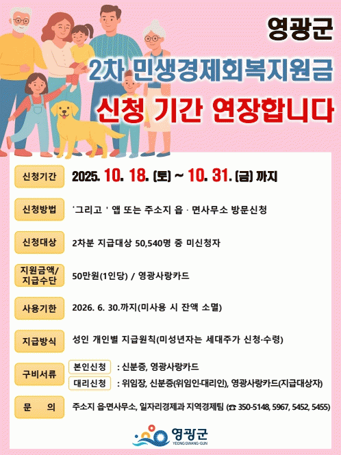 2Â÷ Áö±Þ´ë»ó 50,540¸í Áß ¹Ì½ÅûÀÚ°¡ ´ë»óÀ̸ç, Áö±Þ ±âÁØÀÏÀÎ 2024³â 12¿ù 27ÀϺÎÅÍ ½ÅûÀϱîÁö °è¼ÓÇØ¼ ¿µ±¤±º¿¡ ÁÖ¼Ò¸¦ µÐ ±º¹ÎÀ¸·Î, Áö±Þ±âÁØÀÏ ´ÙÀ½³¯(2024. 12. 28.)ºÎÅÍ ÀüÃâ, »ç¸Á, ¸»¼Ò, °ÅÁÖºÒ¸í µîÀÇ »çÀ¯°¡ ¹ß»ýÇÑ °æ¿ì¿¡´Â Áö±Þ´ë»ó¿¡¼ Á¦¿ÜµÈ´Ù.