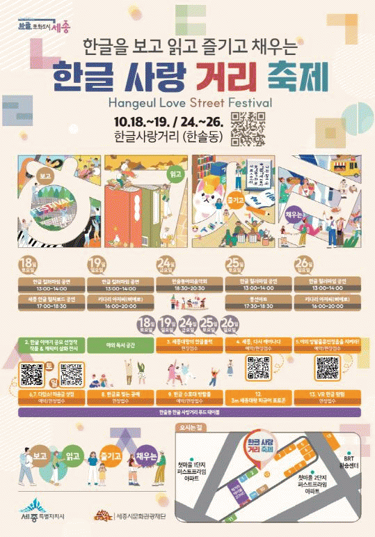 °Å¸® °÷°÷¿¡¼´Â ½Ã¹ÎµéÀÌ ¡®º¸°í¡¯ Áñ±æ ¼ö ÀÖ´Â ´Ù¾çÇÑ °ø¿¬ÀÌ À̾îÁø´Ù. 18ÀÏ¿¡´Â ÇÑ±Û Ä÷¯¸¶ÀÓ ÆÛÆ÷¸Õ½º(13½Ã), ¼¼Á¾°Å¸®¿¹¼ú°¡ °ø¿¬(17½Ã)ÀÌ ÆîÃÄÁö°í 19ÀÏ¡¤25ÀÏ¡¤26ÀÏ¿¡´Â ÇÑ±Û ¸¶ÀÓÆÛÆ÷¸Õ½º(13½Ã)°¡, 24ÀÏ¿¡´Â ÇѼֵ¿ »óÀÎȸ¿Í ÇÔ²²ÇÏ´Â Àú³á À½¾Çȸ(18½Ã30ºÐ)°¡ ÁøÇàµÈ´Ù.