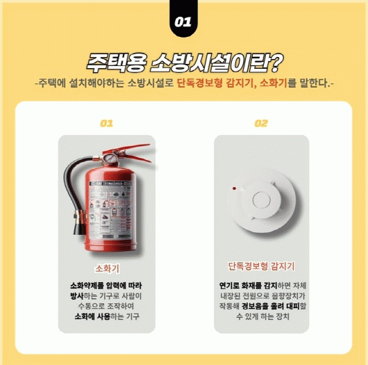 ÁÖÅÃ¿ë ¼Ò¹æ½Ã¼³Àº ÈÀç ¹ß»ý ½Ã ½Å¼ÓÇÑ Áø¾ÐÀÌ °¡´ÉÇÑ ¼Òȱâ¿Í ¿¬±â¸¦ °¨ÁöÇÏ¿© °æº¸À½À» ¿ï¸®´Â ´Üµ¶°æº¸Çü °¨Áö±â·Î ±¸¼ºµÈ´Ù. ÀÌ´Â ÈÀç ¡®°ñµçŸÀÓ¡¯À» È®º¸ÇØ Àθí°ú Àç»ê ÇÇÇØ¸¦ ÃÖ¼ÒÈÇÏ´Â µ¥ ¸Å¿ì Áß¿äÇÑ ±âÃÊ ¾ÈÀü½Ã¼³·Î, 'ÈÀ翹¹æ, ¼Ò¹æ½Ã¼³ ¼³Ä¡¡¤À¯Áö ¹× ¾ÈÀü°ü¸®¿¡ °üÇÑ ¹ý·ü'¿¡ µû¶ó ¸ðµç ÁÖÅÿ¡ ¼³Ä¡°¡ Àǹ«ÈµÇ¾î ÀÖ´Ù.