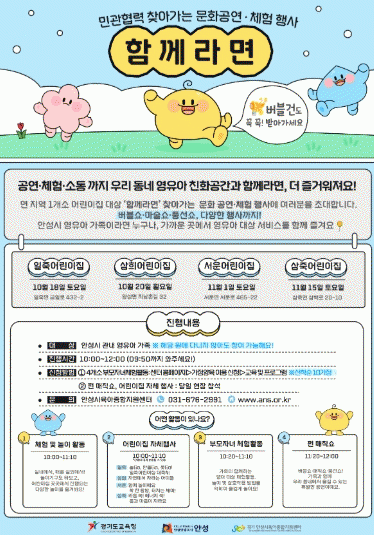 ¡ãÀÏÁ׾ÀÌÁý(10.18.) ¡ã»ïÈñ¾î¸°ÀÌÁý(10.20.) ¡ã¼¿î¾î¸°ÀÌÁý(11.1.) ¡ã»ïÁ׾ÀÌÁý(11.15.) µî 4°³¼Ò¿¡¼ ¡ã¹öºí¡¤¸ÅÁ÷¼î ¡ãºÎ¸ð¡¤ÀÚ³à üÇèȰµ¿ ¡ã¿¡¾î¹Ù¿î½º µî ´Ùä·Î¿î üÇè ÇÁ·Î±×·¥ÀÌ ÁøÇàµÇ¸ç, ¾ÆÀ̵éÀÌ °¡À» ÇÏ´Ã ¾Æ·¡ ¸¶À½²¯ ¿ô°í ¶Ù³î ¼ö ÀÖ´Â ½Ã°£À» ¼±»çÇÒ ¿¹Á¤ÀÌ´Ù.