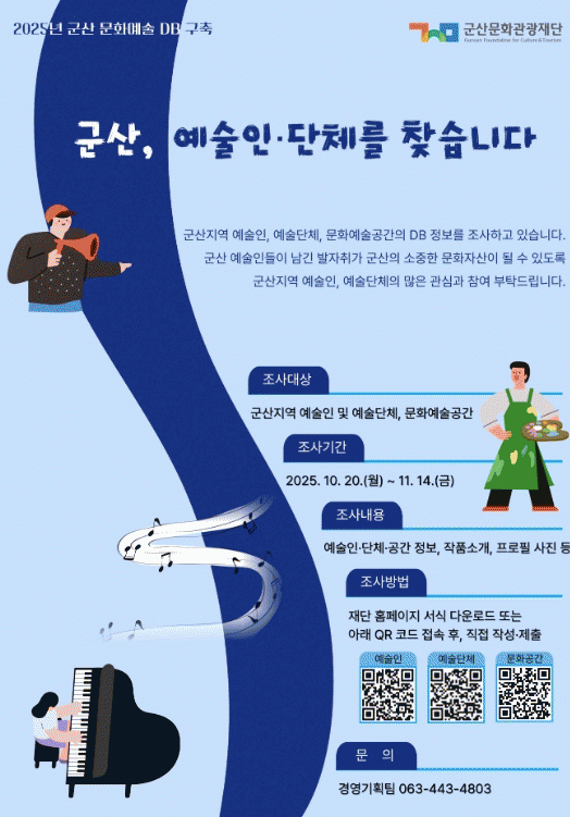 À̹ø »ç¾÷Àº ±º»ê½Ã¿¡¼ Ȱµ¿ÇÏ´Â ¿¹¼úÀΰú ¿¹¼ú´Üü, ¹®È¿¹¼ú°ø°£ÀÇ ÇöȲÀ» ü°èÀûÀ¸·Î Á¶»ç¡¤Á¤¸®ÇÏ¿©, ÇâÈÄ Àç´ÜÀÇ Á¤Ã¥ ¼ö¸³ ¹× »ç¾÷ ÃßÁøÀÇ ±âÃÊÀÚ·á·Î Ȱ¿ëÇϱâ À§ÇØ ¸¶·ÃµÆ´Ù.