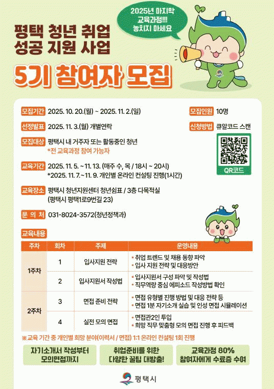 ¸ðÁý ´ë»óÀº ÆòÅýÿ¡ °ÅÁÖÇϰųª Ȱµ¿ÇÏ´Â 19~39¼¼ ±¸Á÷ û³âÀ¸·Î Àü ±³À°°úÁ¤ Âü¿© °¡´ÉÀÚ 10¸íÀ̸ç, ½ÅûÀº ¸ðÁý Æ÷½ºÅÍÀÇ Á¤º¸¹«´Ì(QRÄÚµå)¿¡ Á¢¼ÓÇÏ¿© ½Åû¼¸¦ Á¦ÃâÇÏ¸é µÇ°í, ¼±Á¤ °á°ú´Â 11¿ù 3ÀÏ °³º° Å뺸µÈ´Ù.
