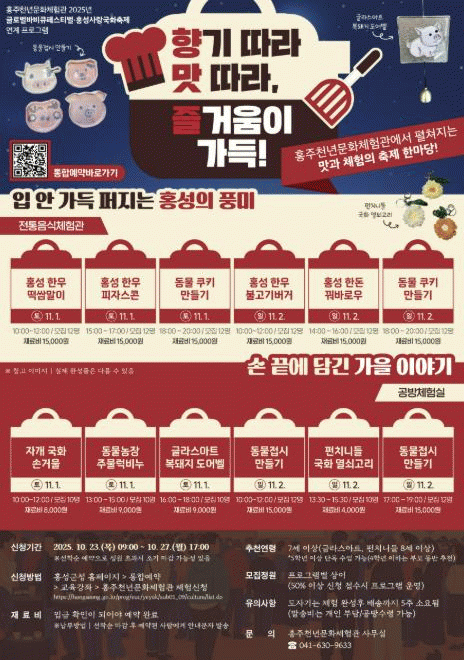 À̹ø ÇÁ·Î±×·¥Àº È«¼ºÀÇ Æ¯»ê¹°ÀÎ ÇÑ¿ì¿Í Çѵ·À» Ȱ¿ëÇÑ À½½Ä¸¸µé±â üÇè°ú °¡À»ÀÇ Á¤Ã븦 ´ãÀº °ø¿¹ üÇèÀ¸·Î ±¸¼ºµÇ¾î, ÃàÁ¦ ±â°£µ¿¾È ¹æ¹®°´µé¿¡°Ô ´õ¿í dz¼ºÇÏ°í ´Ùä·Î¿î Áñ°Å¿òÀ» ¼±»çÇÒ ¿¹Á¤ÀÌ´Ù.
