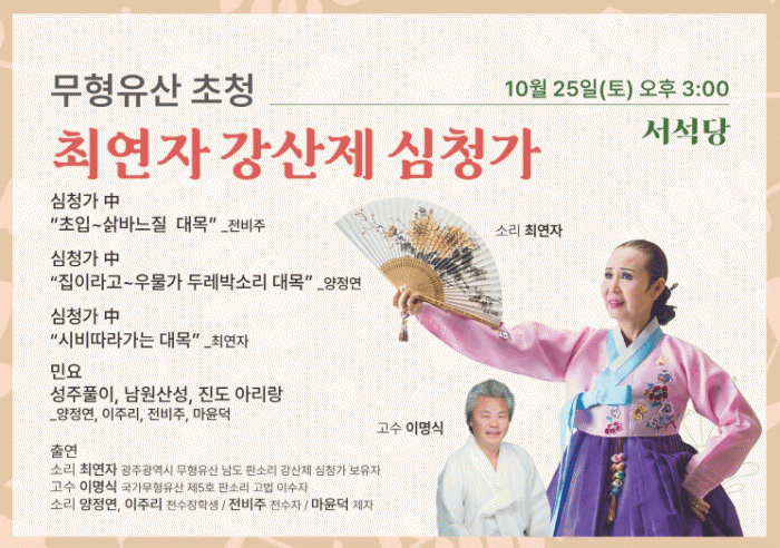 À̹ø °ø¿¬¿¡¼´Â Àü¼öÀÚÀÎ ¾çÁ¤¿¬ ¾¾°¡ ÆÇ¼Ò¸® '½Éû°¡' Áß ¡®ÃÊÀÔ ´ë¸ñ~»í¹Ù´ÀÁú ´ë¸ñ¡¯À», ¾çÁ¤¿¬ Àü¼öÀåÇлýÀÌ ¡®ÁýÀ̶ó°í ´ë¸ñ~¿ì¹°°¡ µÎ·¹¹Ú¼Ò¸® ´ë¸ñ¡¯À» µé·ÁÁØ´Ù. À̾î ÃÖ¿¬ÀÚ ¸íâÀº °í¼ö À̸í½Ä(±¹°¡¹«ÇüÀ¯»ê Á¦5È£ ÆÇ¼Ò¸® °í¹ý À̼öÀÚ)°ú ÇÔ²² ¡®½Ãºñ µû¶ó°¡´Â ´ë¸ñ¡¯À» ¼±º¸À̸ç, °ø¿¬ÀÇ ¸¶Áö¸·Àº Ã⿬ÀÚ Àü¿øÀÌ ÇÔ²²ÇÏ´Â ¹Î¿ä ¡®¼ºÁÖÇ®ÀÌ, ³²¿ø»ê¼º, Áøµµ¾Æ¸®¶û¡¯À¸·Î Àå½ÄµÈ´Ù.