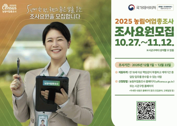 18¼¼ ÀÌ»ó ³ó¸²¾î¾÷ÃÑÁ¶»ç¿¡ °ü½ÉÀÌ ÀÖ°í Åë°èÁ¶»ç ¾÷¹«¿¡ Àü³äÇÒ ¼ö ÀÖ´Â »ç¶÷ÀÌ¸é ´©±¸³ª Áö¿øÇÒ ¼ö ÀÖ´Ù. ¼±¹ßµÈ Á¶»ç¿ä¿øÀº Á¶»ç±³À°À» À̼öÇÑ ÈÄ 12¿ù 2ÀϺÎÅÍ 22ÀϱîÁö °ü³» ³ó°¡¡¤ÀÓ°¡¡¤¾î°¡¸¦ ´ë»óÀ¸·Î ÇöÀåÁ¶»ç¸¦ ¼öÇàÇÑ´Ù.