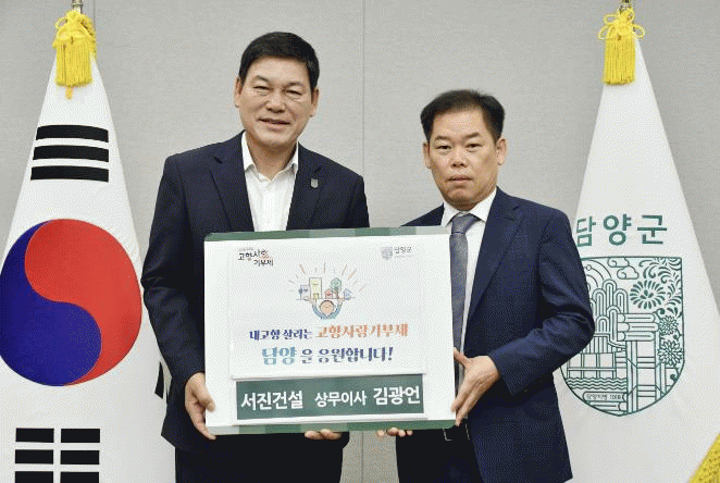 À̹ø ±âºÎ´Â ¢ß¼Áø°Ç¼³±×·ì ½Å¸íÁø ȸÀå°ú ±è±¤¾ð »ó¹«À̻簡 °íÇâ»ç¶û±âºÎÁ¦ÀÇ ÃëÁö¿¡ ±íÀÌ °ø°¨ÇÏ¸ç ´ã¾ç±ºÀÇ Áö¿ª ¹ßÀü¿¡ À̹ÙÁöÇϰíÀÚ °áÁ¤ÇÑ °ÍÀ¸·Î, °¢°¢ 500¸¸ ¿ø¾¿ ÃÑ 1,000¸¸ ¿øÀ» ±âŹÇß´Ù.