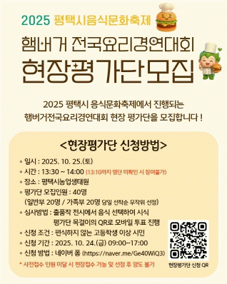 °æ¿¬´ëȸÀÇ »ý»ýÇÑ ÇöÀåÀ» ÇÔ²²ÇÒ ½Ã¹Î ÇöÀåÆò°¡´Üµµ »çÀü ¸ðÁýÇÑ´Ù. 10¿ù 24ÀÏ(±Ý) ¿ÀÀü 9½ÃºÎÅÍ ¿ÀÈÄ 5½Ã±îÁö ÀÏ¹ÝºÎ¿Í °¡Á·ºÎ °¢ 20¸í¾¿ ¹«ÀÛÀ§·Î ¼±Âø¼ø Á¢¼ö¹ÞÀ¸¸ç, Æí½Ä ¾ø´Â °íµîÇлý ÀÌ»óÀ̶ó¸é ´©±¸³ª ½ÅûÇÒ ¼ö ÀÖ°í, ¼±Á¤µÈ Áö¿øÀÚ´Â ½ÇÁ¦ °æ¿¬ ÇöÀå¿¡¼ ¿ä¸®¸¦ ¸Àº¸°í Æò°¡ÇÏ°Ô µÈ´Ù.