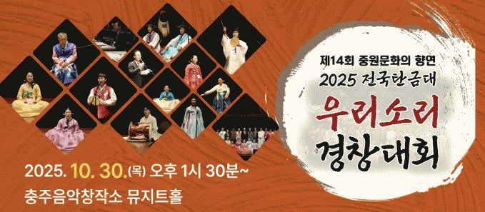 ÀüÅë¹®È °è½Â°ú ±¹¾Ç ÀÎÀç ¹ß±¼À» À§ÇØ ¿¸®´Â¡®2025 Àü±¹Åº±Ý´ë¿ì¸®¼Ò¸®°æÃ¢´ëȸ¡¯°¡ ¿À´Â 30ÀÏ, ÃæÁÖÀ½¾ÇâÀÛ¼Ò ¹ÂÁöƮȦ¿¡¼ °³ÃֵȴÙ.