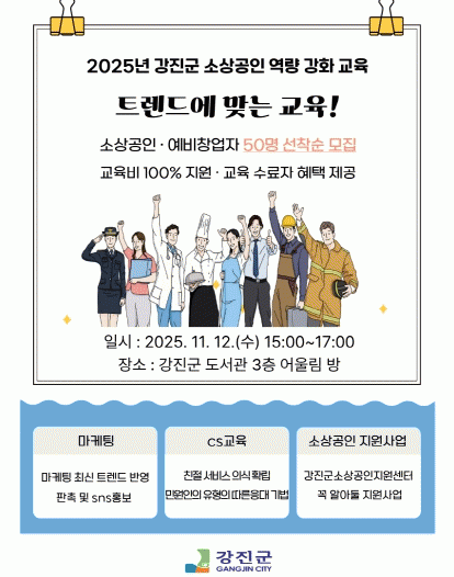 À̹ø ±³À°Àº °³ÀÎ(¼Ò»ó°øÀÎ ¹× ¿¹ºñâ¾÷ÀÚ)°ú ´Üü(»óÀÎȸ ¹× ¿¹ºñ »óÀÎȸ)·Î ³ª´² Á¢¼ö¹ÞÀ¸¸ç, ÃÑ 50¸íÀ» ¼±Âø¼ø ¸ðÁýÇÑ´Ù. °³ÀÎÀº ½Åû¼¿Í °³ÀÎÁ¤º¸ Á¦°ø µ¿ÀǼ¸¦, ´Üü´Â ´Üü¿ë ½Åû¼¸¦ ÀÛ¼ºÇØ 11¿ù 7ÀϱîÁö °Áø±ºÃ» Áö¿ª°æÁ¦¿¬°áÆÀ¿¡ Á÷Á¢ Á¦ÃâÇϰųª °Áø±º ´©¸®Áý ¼Ò»ó°øÀÎÁö¿ø¼¾Å͸¦ ÅëÇØ ¿Â¶óÀÎÀ¸·Î ½ÅûÇÏ¸é µÈ´Ù.