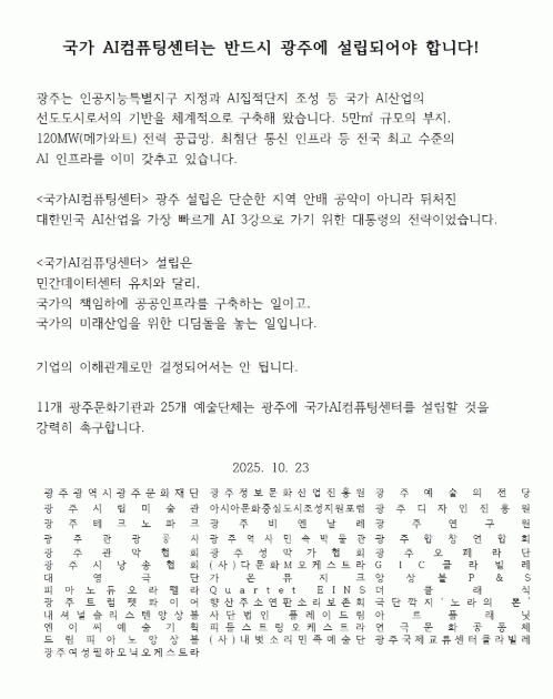 ±¤ÁÖ¹®È¿¹¼ú°è´Â ¡°AI»ê¾÷ÀÇ ±ÕÇü¹ßÀü°ú ±¹°¡°æÀï·Â °È¸¦ À§ÇØ ±¤ÁÖ¿¡ ±¹°¡AIÄÄÇ»ÆÃ¼¾ÅͰ¡ ¼³¸³µÇ¾î¾ß ÇÑ´Ù¡±¸ç ¡°¹®È¿¹¼ú°ú ±â¼úÀÌ °øÁ¸Çϴ âÀǵµ½Ã ±¤ÁÖ¿¡¼ ´ëÇѹα¹ AI»ê¾÷ÀÇ »õ·Î¿î µµ¾àÀÌ ½ÃÀÛµÇ±æ ¹Ù¶õ´Ù¡±°í µ¡ºÙ¿´´Ù.