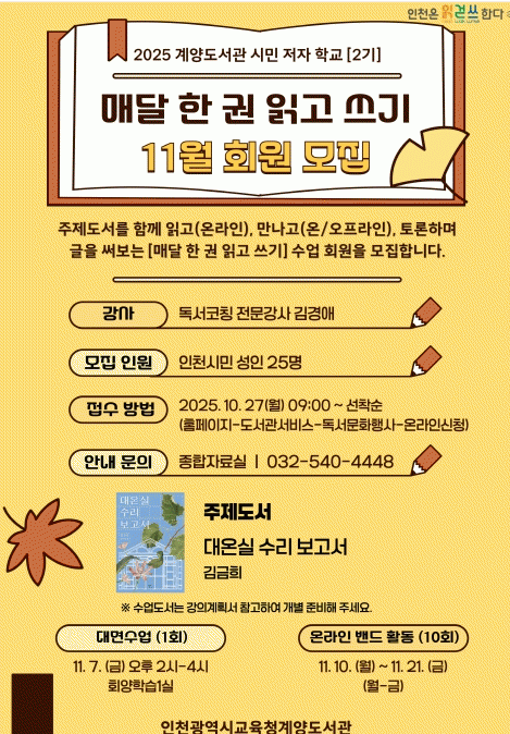 ¡®¸Å´Þ ÇÑ ±Ç ÀÐ°í ¾²±â¡¯´Â ÇÑ ±ÇÀÇ Ã¥À» ±íÀÌ ÀÐ°í ±× ¾È¿¡¼ ¹ß°ßÇÑ »ý°¢°ú °¨Á¤À» ±Û·Î Ç¥ÇöÇÏ´Â ½Ã¹Î âÀÛÇü µ¶¼ ÇÁ·Î±×·¥À¸·Î 11¿ùÀÇ ÁÖÁ¦ µµ¼´Â ±è±ÝÈñ ÀÛ°¡ÀÇ ¡®´ë¿Â½Ç ¼ö¸® º¸°í¼¡¯ÀÌ´Ù.