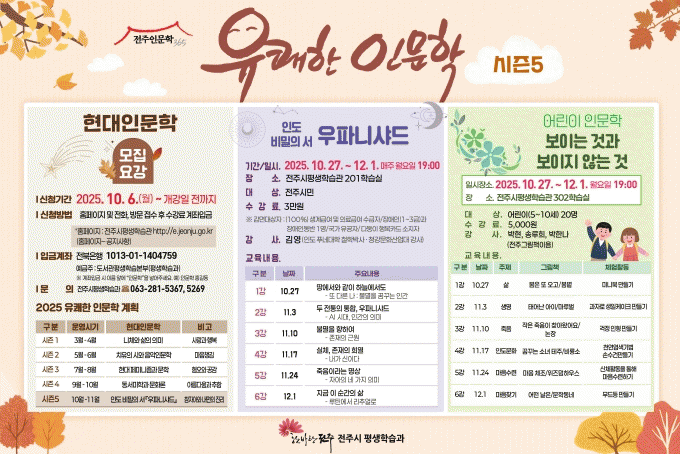 ½Ã´Â ¿À´Â 27ÀϺÎÅÍ 12¿ù 1ÀϱîÁö ¸ÅÁÖ ¿ù¿äÀϰú È¿äÀÏ ¿ÀÈÄ 7½Ã, ÀüÁÖ½ÃÆò»ýÇнÀ°ü¿¡¼ ½Ã¹ÎµéÀÌ Àϻ󿡼 Àι®ÇÐÀ» ½±°Ô Á¢ÇÒ ¼ö ÀÖµµ·Ï µ½±â À§ÇÑ ¡®À¯ÄèÇÑ Àι®ÇС¯ °Á¸¦ ¿î¿µÇÑ´Ù.