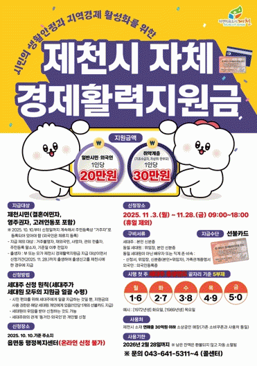 Áö±Þ ´ë»óÀº ±âÁØÀÏÀÎ 2025³â 10¿ù 10ÀϺÎÅÍ ½ÅûÀϱîÁö Á¦Ãµ½Ã¿¡ Áֹεî·ÏÀ» µÎ°í ÀÖ´Â Á¦Ãµ½Ã¹Î°ú Á¦Ãµ½Ã¿¡ ü·ùÁö¸¦ µÎ°í ÀÖ´Â °áÈ¥À̹ÎÀÚ¡¤¿µÁÖ±ÇÀÚ¡¤°í·ÁÀÎ µ¿Æ÷ÀÌ´Ù. ´Ü, »ç¸ÁÀÚ¿Í °ü¿Ü ÀüÃâÀÚ, Áֹεî·Ï ¸»¼ÒÀÚ´Â Áö±Þ´ë»ó¿¡¼ Á¦¿ÜµÈ´Ù.
