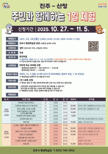 ¼ö°·á´Â ¹«·áÀ̸ç, Àç·áºñ°¡ ÀÖ´Â °ú¸ñÀº Âü°¡ÀÚ ºÎ´ãÀ¸·Î ÁøÇàÇÑ´Ù. ±âŸ ÀÚ¼¼ÇÑ »çÇ×Àº Æò»ýÇнÀ°ü ´©¸®Áý ¶Ç´Â Æò»ýÇнÀ°ü ±³À°¿î¿µÆÀÀ¸·Î ¹®ÀÇÇÏ¸é µÈ´Ù.