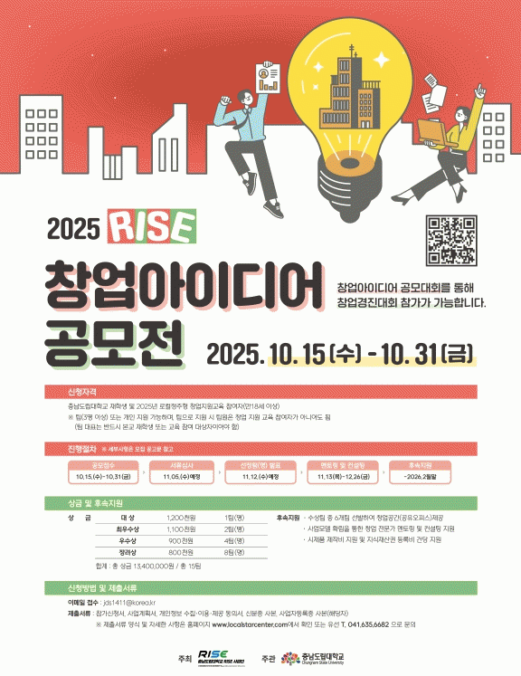 °ø¸ð Á¢¼ö´Â ¿À´Â 31ÀϱîÁö ÁøÇàµÇ¸ç, ÀÚ¼¼ÇÑ ³»¿ëÀº Ãæ³²µµ¸³´ëÇб³ RISE»ç¾÷´Ü ȨÆäÀÌÁö ¶Ç´Â °ø½Ä ¾È³»¹®À» ÅëÇØ È®ÀÎÇÒ ¼ö ÀÖ´Ù.