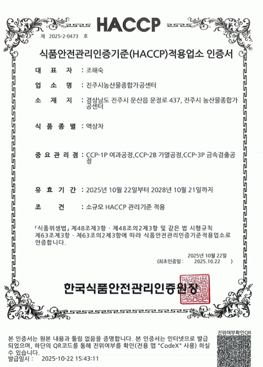 ÁøÁֽà ³ó»ê¹°Á¾ÇÕ°¡°ø¼¾ÅÍ´Â Áö¿ª³ó»ê¹°À» Ȱ¿ëÇØ °¡°øÁ¦Ç° °³¹ß°ú ³ó¾÷ÀÎÀÇ ¼ÒµæÃ¢ÃâÀ» µ½°í ÀÖÀ¸¸ç, Áö³ÇØ 7¿ù °úäÁÖ½º·ù¿Í ĵµð·ù 2°³ À¯Çü¿¡ ´ëÇØ ¡®HACCP¡¯ ÀÎÁõÀ» ¹ÞÀº ÈÄ, ¿ÃÇØ 10¿ù 22ÀÏ Àë·ù¿Í ¾×»óÂ÷ 2°³ À¯ÇüÀ» Ãß°¡·Î ÀÎÁõ¹Þ¾Æ ³ó»ê¹°Á¾ÇÕ°¡°ø¼¾ÅÍ¿¡¼ »ý»êµÇ´Â Á¦Ç°ÀÇ ¾ÈÀü¼º°ú ½Å·Úµµ¸¦ ÇÑÃþ ´õ ³ô¿´´Ù.