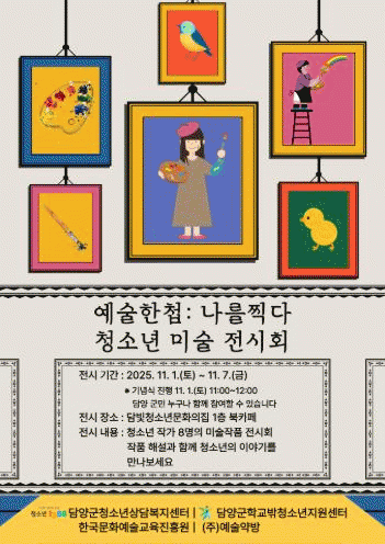 À̹ø Àü½Ã´Â Çѱ¹¹®È¿¹¼ú±³À°ÁøÈï¿ø ¡®¸¶À½Ä¡À¯, º½Ã³·³¡¯ °ø¸ð»ç¾÷¿¡ Àü³² 22°³ ½Ã¡¤±º °¡¿îµ¥ À¯ÀÏÇÏ°Ô ¼±Á¤µÈ ´ã¾ç±ºÃ»¼Ò³â»ó´ãº¹Áö¼¾ÅÍ¿Í Çб³¹Ûû¼Ò³âÁö¿ø¼¾ÅͰ¡ 5¿ùºÎÅÍ 9¿ù±îÁö ÁøÇàÇÑ ¿¹¼úȰµ¿ÀÇ °á°ú¹°ÀÌ´Ù.