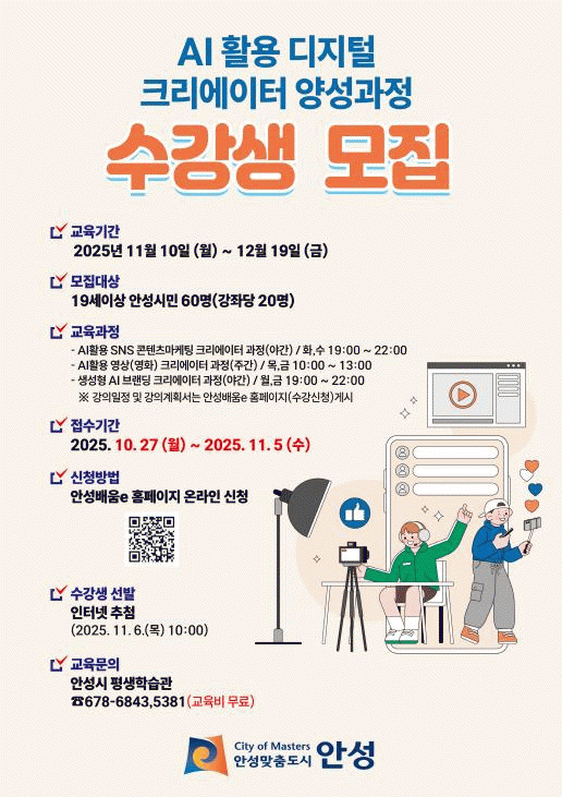 ±³À°Àº µðÁöÅÐ ÄÜÅÙÃ÷ Á¦ÀÛ ¿ª·®À» ³ôÀÌ´Â µ¥ ÁßÁ¡À» µÎ°í ¡ãAI Ȱ¿ë SNS ÄÜÅÙÃ÷ ¸¶ÄÉÆÃ Å©¸®¿¡ÀÌÅͰúÁ¤ ¡ãAI Ȱ¿ë ¿µ»ó(¿µÈ) Å©¸®¿¡ÀÌÅͰúÁ¤ ¡ã»ý¼ºÇü AI ºê·£µù Å©¸®¿¡ÀÌÅÍ µî 3°³ °úÁ¤À¸·Î ¿î¿µµÈ´Ù. ±³À° ±â°£Àº 11¿ù 10ÀÏ(¿ù)ºÎÅÍ 12¿ù 19ÀÏ(±Ý)±îÁöÀÌ¸ç °úÁ¤º° ¼¼ºÎÀÏÁ¤Àº ¡®¾È¼º ¹è¿òe¡¯¿¡¼ È®ÀÎÇÒ¼ö ÀÖ´Ù. °¢ °úÁ¤º°·Î 20¸í¾¿ ¸ðÁýÇÑ´Ù.