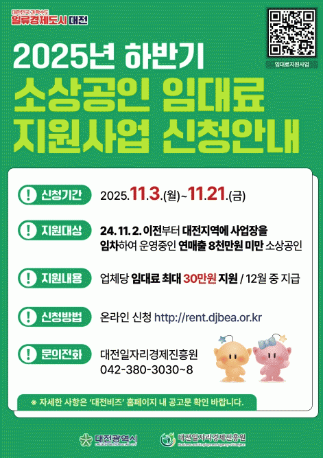 ½ÅûÀº 11¿ù 3ÀϺÎÅÍ 21ÀϱîÁö ¿Â¶óÀÎÀ¸·Î Á¢¼ö ¹ÞÀ¸¸ç, ½Åû ´ë»óÀº °ø°íÀÏ ±âÁØ 1³â ÀÌ»ó ´ëÀü½Ã¿¡¼ »ç¾÷ÀåÀ» ÀÓÂ÷ÇØ ¿î¿µ ÁßÀÎ ¼Ò»ó°øÀÎÀ¸·Î, ¿¬ ¸ÅÃâ¾× 8õ¸¸ ¿ø ¹Ì¸¸À̾î¾ß ÇÑ´Ù.