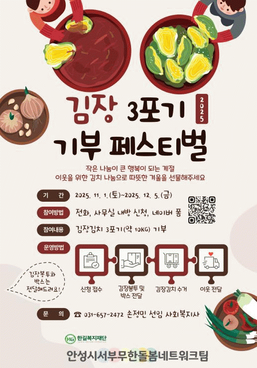 ±èÀå±èÄ¡ Æ÷Àå¿ë ºñ´ÒºÀÅõ¿Í ģȯ°æ Æ÷Àå¹Ú½º¸¦ ¹«·á·Î Á¦°øÇÏ¿© ±âºÎÀÚÀÇ ºÎ´ãÀ» ´ú°í ±èÀå±èÄ¡´Â ´çÀÏ ¼ö°Å ¹× Àü´ÞÇÏ¿© ½Å¼±ÇÔÀ» ´õÇØ ¿øÈ°È÷ Áö¿øÇÒ ¿¹Á¤ÀÌ´Ù. Âü¿©¸¦ ¿øÇÏ´Â ½Ã¹ÎÀº ÀüÈ ¶Ç´Â ¿Â¶óÀÎ(³×À̹ö Æû) ½ÅûÀÌ °¡´ÉÇϸç ÀÚ¼¼ÇÑ ¹®ÀÇ´Â ¾È¼º½Ã¼ºÎ¹«Çѵ¹º½³×Æ®¿öÅ©ÆÀÀ¸·Î ÇÏ¸é µÈ´Ù.