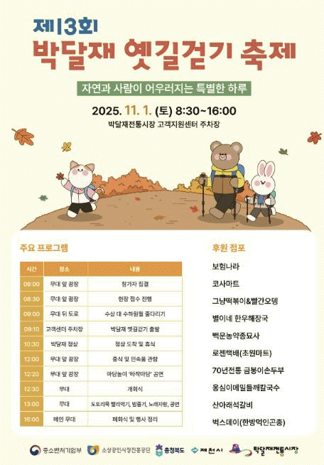 À̹ø °È±â´ëȸ´Â ¹Ú´ÞÀç ÀüÅë½ÃÀå °í°´Áö¿ø¼¾ÅÍ¿¡¼ Ãâ¹ßÇØ ¹Ú´ÞÀç È޾縲À» °ÅÃÄ ¹Ú´ÞÀç ¿¾±æÀ» µû¶ó Á¤»óÀ» µ¹¾Æ¿À´Â ÄÚ½º·Î, ³²³à³ë¼Ò ´©±¸³ª Âü°¡ÇÒ ¼ö ÀÖÀ¸¸ç, °È±â´ëȸ ÈÄ¿¡´Â ¸¶´ç³îÀÌ °ø¿¬, ³ë·¡ÀÚ¶û, °æÇ°Ãß÷ µî ´Ù¾çÇÑ À̺¥Æ®¿Í üÇèȰµ¿ÀÌ ÁøÇàµÉ ¿¹Á¤ÀÌ´Ù.