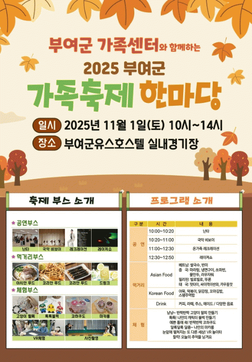 ÃàÁ¦´Â ¿ÀÀü 10½Ã ºÎ¿©±º °¡Á·¼¾ÅÍ ´Ù±¹Àû ÀÚÁ¶ ¸ðÀÓÀÇ ³Å¸ °ø¿¬À¸·Î ¸·À» ¿¸ç, ÀÌ¾î ±¹¾Ç ºñº¸ÀÌ °ø¿¬°ú ·¹ÀÌÀú¼î µî ´Ù¾çÇÑ º¼°Å¸®¸¦ ÁغñÇß´Ù.