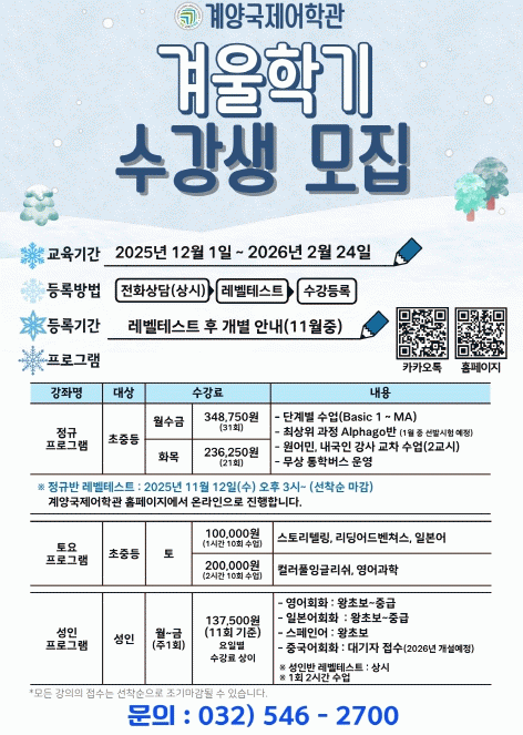 À̹ø Çбâ´Â 2026³â 2¿ù 24ÀϱîÁö ¿î¿µµÇ¸ç, Ãʵî»ýºÎÅÍ ¼ºÀαîÁö ´Ù¾çÇÑ ¿¬·ÉÃþÀ» ´ë»óÀ¸·Î ¿µ¾î Áß½ÉÀÇ ±³À° ÇÁ·Î±×·¥ÀÌ °³¼³µÈ´Ù.