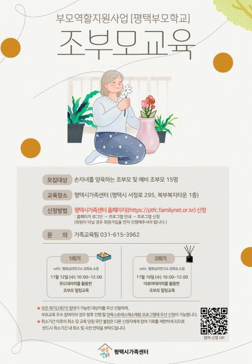 ±³À°Àº ¿À´Â 11¿ù 12Àϰú 19ÀÏ ¿ÀÀü 10½ÃºÎÅÍ 12½Ã±îÁö ÃÑ 2ȸ±â·Î ÁøÇàµÇ¸ç, Àå¼Ò´Â ÆòÅýà ¼Á¤·Î 295(ºÏºÎº¹ÁöŸ¿î 1Ãþ)¿¡ ÀÖ´Â ÆòÅýð¡Á·¼¾ÅÍ ±³À°ÀåÀÌ´Ù. Âü¿© ½ÅûÀº ÆòÅýð¡Á·¼¾ÅÍ ´©¸®ÁýÀ» ÅëÇØ °¡´ÉÇÏ´Ù.