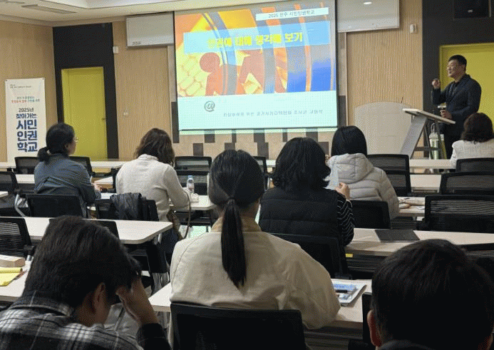 ¹Î°£À§Å¹±â°ü Á÷¿ø 100¿© ¸íÀ» ´ë»óÀ¸·Î ÀüÁֽà µµ½ÃÀç»ýÁö¿ø¼¾ÅÍ¿¡¼ ÁøÇàµÈ À̳¯ ±³À°¿¡´Â °íÇü¼® îñ ±¹°¡ÀαÇÀ§¿øÈ¸ ±¤Áֻ繫¼Ò Á¶»ç°üÀÌ °»ç·Î ÃÊûµÅ Àϻ󿡼ÀÇ ÀÎ±Ç Ä§ÇØ »óȲÀ» ¼Ò°³Çϰí, Âü¼®ÀÚµé°ú À뱂 ½Çõ ¹æ¾ÈÀ» ÇÔ²² ¸ð»öÇÏ´Â ½Ã°£À» °¡Á³´Ù.