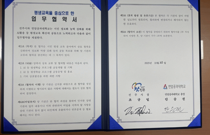 À̹ø Çù¾àÀº ¾ç ±â°üÀÌ »óÈ£ Çù·ÂÀ» ÅëÇØ ½Ã¹ÎµéÀÇ Á¤º¸È ¿ª·®À» ³ôÀÌ°í Æò»ý±³À° ±âȸ¸¦ È®´ëÇϱâ À§ÇØ ¸¶·ÃµÆ´Ù. Çù¾à¼¿¡ µû¸£¸é, ÁøÁÖ½Ã¿Í ¿¬¾Ï°ø°ú´ëÇб³´Â AI µî Ãֽбâ¼úÀ» Á¢¸ñÇÑ Æò»ýÇнÀ ÇÁ·Î±×·¥À» °øµ¿À¸·Î ±âȹ¡¤¿î¿µÇϰí, ÇØ´ç ÇÁ·Î±×·¥À» Àû±Ø È«º¸ÇÏ´Â µ¥¿¡µµ Çù·ÂÇÒ ¿¹Á¤ÀÌ´Ù.