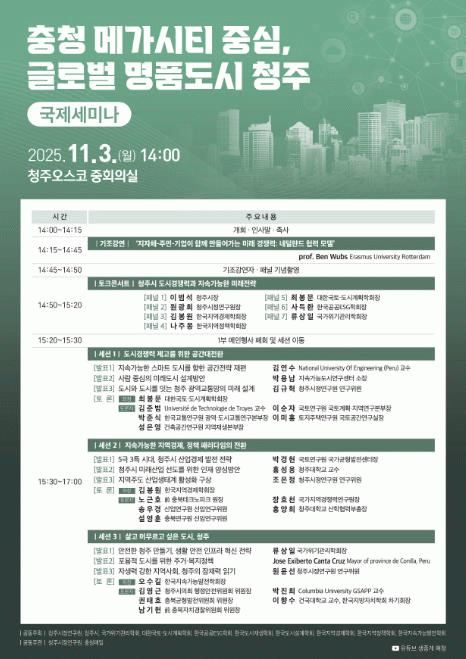 ÅäÅ©ÄܼƮ´Â ¡®Ã»Áֽà µµ½Ã °æÀï·Â°ú Áö¼Ó°¡´ÉÇÑ ¹Ì·¡ Àü·«¡¯À» ÁÖÁ¦·Î À̹ü¼® ½ÃÀå, ¿ø±¤Èñ ûÁÖ½ÃÁ¤¿¬±¸¿øÀå, ±èºÀ¿ø Çѱ¹Áö¿ªÇÐȸÀå, ³ªÁÖ¸ù Çѱ¹Áö¿ªÁ¤Ã¥ÇÐȸÀå, ÃÖºÀ¹® ´ëÇѱ¹Å䡤µµ½Ã°èȹÇÐȸÀå, »çµæÈ¯ Çѱ¹°ø°øESGÇÐȸÀå, ·ù»óÀÏ ±¹°¡À§±â°ü¸®ÇÐȸÀåÀÌ ÆÐ³Î·Î Âü¼®ÇØ ÁøÇàµÆ´Ù.