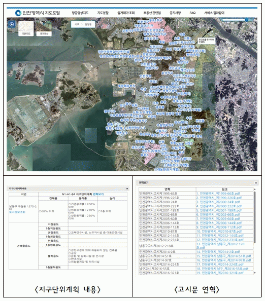 ½Ã¹ÎÀº ÀÎõ½Ã ÁöµµÆ÷Åп¡ Á¢¼ÓÇØ ÁÖ¼Ò ÀÔ·Â ¶Ç´Â À§Ä¡ ¼±Åø¸À¸·Î ÇØ´ç ÅäÁöÀÇ Áö¹ø, Áö¸ñ, ¸éÀû µî ±âº»Á¤º¸¿Í ÇÔ²² Áö±¸´ÜÀ§°èȹ±¸¿ª, °ÇÃ๰ ¿ëµµ, °ÇÆóÀ², ¿ëÀû·ü, ³ôÀÌ µî ¼¼ºÎÁ¤º¸¸¦ ÇÑ´«¿¡ È®ÀÎÇÒ ¼ö ÀÖ´Ù. ¶ÇÇÑ, °¢ ±¸¿ªº° °í½Ã¹® ´Ù¿î·Îµå ±â´Éµµ Á¦°øµÈ´Ù.