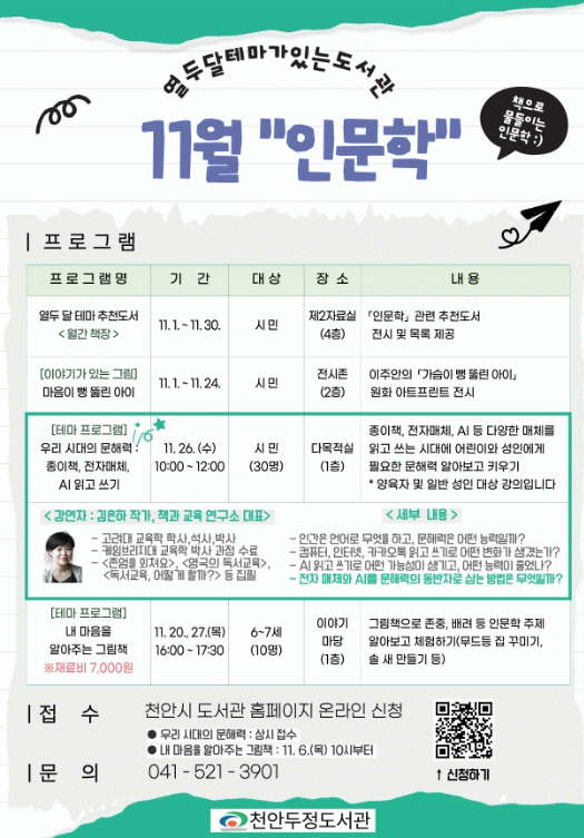 ÀÌ¿Í ÇÔ²² Å׸¶ ÇÁ·Î±×·¥À¸·Î´Â ¿À´Â 26ÀÏ ¼ºÀÎ ´ë»ó ¡®¿ì¸® ½Ã´ëÀÇ ¹®Çط¡¯, 20¡¤27ÀÏ 6~ 7¼¼ ´ë»ó ¡®³» ¸¶À½À» ¾Ë¾ÆÁÖ´Â ±×¸²Ã¥¡¯ ÇÁ·Î±×·¥À» ¿î¿µÇÑ´Ù.