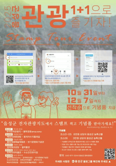 ½ºÅÆÇÁ Åõ¾î À̺¥Æ®´Â ´ëÇѹα¹ ±¹¹Î ´©±¸³ª Âü¿©ÇÒ ¼ö ÀÖ´Ù. À½¼º±º ÀüÀÚ°ü±¤Áöµµ »çÀÌÆ®¿¡ ȸ¿ø°¡ÀÔ ÈÄ 6°³ÀÇ °ü±¤ ÄÚ½º¸¦ ¹æ¹®ÇÏ¸é ½º¸¶Æ®Æù À§Ä¡Á¤º¸¸¦ ÅëÇØ ÀÚµ¿À¸·Î ÀüÀÚ ½ºÅÆÇÁ¸¦ ȹµæÇÒ ¼ö ÀÖ°í, 1ÀÎÀÌ ÄÚ½º ´ç °ü±¤±â³äǰ 1°³¾¿ ÃÑ 6°³±îÁö ¼ö·É °¡´ÉÇÏ´Ù.