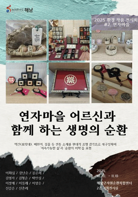 À̹ø Àü½Ã´Â Ȳ»ê¸é ¿¬ÀÚ¸¶À» ¾î¸£½Å 11¸íÀÌ Âü¿©ÇÑ °øµ¿ ÀÛǰÀüÀ¸·Î, ¹ö·ÁÁö´Â ³ó°¡ ºÎ»ê¹°°ú ÀüÅë Àç·á¸¦ Ȱ¿ëÇØ¡®¼øÈ¯¡¯°ú¡®Áö¼Ó°¡´ÉÇÑ »î¡¯À» ÁÖÁ¦·Î ÇÑ Ã¢ÀÛ ÀÛǰµéÀ» ¼±º¸ÀδÙ. ¾î¸£½ÅµéÀº ¸Æ°£(º¸¸´´ë), ÆóÇÑÁö, ¤Ǯ µî ÀÚ¿¬ ¼ÒÀ縦 »ç¿ëÇÏ¿© ÀüÅë °ø¿¹ÀÇ Á¤¼º°ú Çö´ëÀû Á¶Çü °¨°¢À» °áÇÕ, ¹ö·ÁÁø °Í ¼Ó¿¡¼µµ »õ »ý¸íÀ» ã¾Æ³»´Â¡®¼øÈ¯ÀÇ ¹ÌÇС¯À» Ç¥ÇöÇß´Ù.