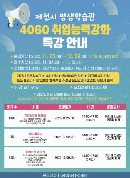 ¼ö° ½Åû ±âÇÑÀº 11¿ù 12ÀϱîÁöÀ̸ç, Á¦Ãµ½Ã Æò»ýÇнÀ°ü ´©¸®Áý¿¡ °Ô½ÃµÈ ¸ðÁý °ø°í¹®À» Âü°íÇÏ¿© ¿Â¶óÀÎÀ¸·Î ½ÅûÇÒ ¼ö ÀÖ´Ù.