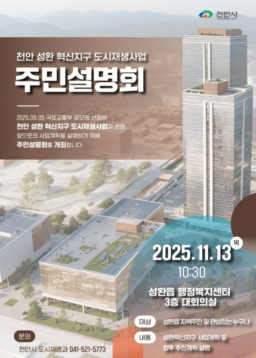 À̹ø ¼³¸íȸ´Â õ¾È ¼ºÈ¯ Çõ½ÅÁö±¸°¡ Áö³ 9¿ù 5ÀÏ ±¹Åä±³ÅëºÎ µµ½ÃÀç»ý Çõ½ÅÁö±¸ °ø¸ð»ç¾÷¿¡ ÃÖÁ¾ ¼±Á¤µÊ¿¡ µû¶ó, »ç¾÷ÀÇ ÁÖ¿ä ³»¿ë°ú ½ÃÀÇ ÇâÈÄ ÃßÁø°èȹÀ» Áö¿ª Áֹε鿡°Ô ¾Ë¸®°í ÀǰßÀ» ¼ö·ÅÇϱâ À§ÇÑ ÀÚ¸®ÀÌ´Ù.