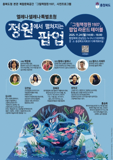 11¿ù 24ÀÏ ¿ÀÈÄ 2½Ã¿¡´Â ÃæºÏµµÀÇȸ ´Ù¸ñÀûȸÀǽǿ¡¼ ¡®±×¸²Ã¥Á¤¿ø 1937¡¯ ÆË¾÷ ¶ó¿îµåÅ×À̺í(¿øÅ¹È¸ÀÇ)ÀÌ °³ÃֵȴÙ. ÆË¾÷ºÏ¿¡ °ü½É ÀÖ´Â ÀϹÝÀÎ ¾à 100¸íÀ» ´ë»óÀ¸·Î ±¹³»¿Ü ±×¸²Ã¥ Àü¹®°¡µéÀÇ °¿¬°ú Åä·ÐÀÌ À̾îÁø´Ù.