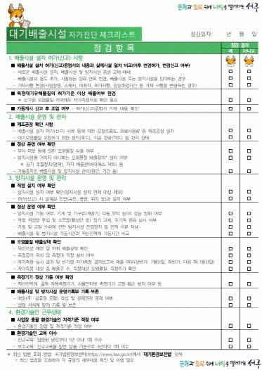 ÀÚ°¡Áø´Ü üũ¸®½ºÆ®´Â ¡®´ë±â¹èÃâ½Ã¼³¡¯°ú ¡®Æó¼ö¹èÃâ½Ã¼³¡¯ 2Á¾À¸·Î ±¸¼ºµÆÀ¸¸ç, »ç¾÷ÀåÀÌ ½º½º·Î ¿À¿°¹°Áú ¹èÃâ½Ã¼³ ¹× ¹æÁö½Ã¼³ Àü¹ÝÀ» Á¡°ËÇÒ ¼ö ÀÖµµ·Ï ¿î¿µÀÏÁö ÀÛ¼º ¹× ÀÚ°¡ÃøÁ¤ ÀÌÇà ¿©ºÎ µî »ç¾÷Àå¿¡¼ °£°úÇϱ⠽¬¿î ȯ°æ ¹ý±Ô»ó Çʼö Áؼö»çÇ×À» ´ã°í ÀÖ´Ù.