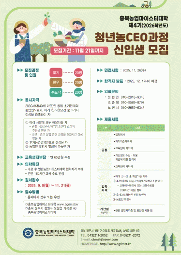 ÀÀ½Ã¿ø¼ Á¢¼ö´Â 11¿ù 30ÀϱîÁö ÃæºÏ³ó¾÷¸¶À̽ºÅÍ´ëÇÐ º»ºÎ¿¡¼ ÁøÇàµÇ¸ç, ¼·ù¿Í ¸éÁ¢½É»ç¸¦ °ÅÃÄ 12¿ù 17ÀÏ ÇÕ°ÝÀÚ¸¦ ¹ßÇ¥ÇÑ´Ù. ±× ¿Ü ÀÚ¼¼ÇÑ »çÇ×Àº ÃæºÏ³ó¾÷¸¶À̽ºÅÍ´ëÇРȨÆäÀÌÁö ¶Ç´Â À¯¼±Àüȸ¦ ÅëÇØ ¹®ÀÇÇÏ¸é µÈ´Ù.