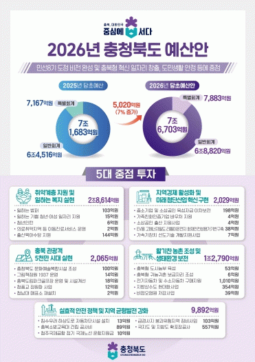 2026³âµµ ¿¹»ê¾ÈÀº ±Ý³âµµ ´çÃÊ¿¹»ê 7Á¶ 1,683¾ï¿øº¸´Ù 5,020¾ï¿ø(7.0%)ÀÌ Áõ°¡ÇÑ 7Á¶ 6,703¾ï¿ø ±Ô¸ð´Ù. ÀϹÝȸ°è´Â 4,304¾ï¿ø(6.7%) Áõ°¡ÇÑ 6Á¶ 8,820¾ï¿ø, Ưº°È¸°è´Â 716¾ï¿ø(10.0%) Áõ°¡ÇÑ 7,883¾ï¿øÀÌ´Ù.