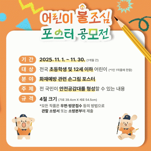 À̹ø °ø¸ðÀüÀº Áö¿ª ³» ÃʵîÇлýÀ̳ª 12¼¼ ÀÌÇÏ ¾î¸°À̸¦ ´ë»óÀ¸·Î ¾ÈÀüÀǽÄÀ» ÇÔ¾çÇϰíÀÚ ÈÀ翹¹æ ¸Þ½ÃÁö¸¦ ´ãÀº 4Àý µµÈÁö(°¡·Î 39.4cm ¡¿ ¼¼·Î 54.5cm) ±Ô°Ý¿¡ Á÷Á¢ ±×¸° Æ÷½ºÅÍ ±×¸²À¸·Î 1ÀÎ 1ÀÛǰ¸¸ Á¦ÃâÇÒ ¼ö ÀÖ°í Á¦Ãâ ±âÇÑÀº ÀÌ´Þ 21ÀϱîÁö·Î ÇØ³²¼Ò¹æ¼ ¿¹¹æ¾ÈÀü°ú¸¦ Á÷Á¢ ¹æ¹®ÇØ Á¦ÃâÇϰųª ¿ìÆí Á¢¼öµµ °¡´ÉÇÏ´Ù.