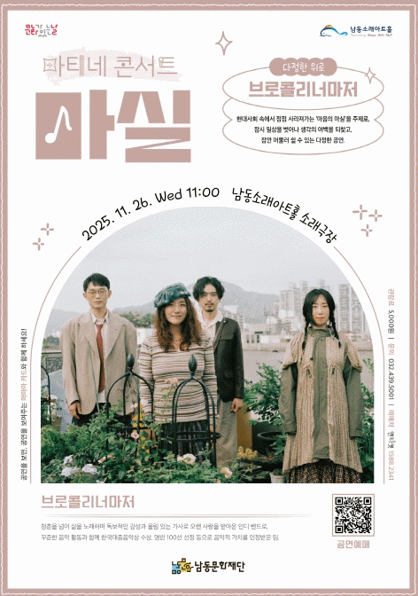 ÇÑÆí, ¸¶Æ¼³×ÄܼƮ ¸¶½ÇÀº ¿©À¯·Î¿î ¿ÀÀü ½Ã°£¿¡ Æí¾ÈÇÏ°Ô ¡®¸¶½Ç¡¯ °¡´Â ¸¶À½À¸·Î ¹®È»ýȰÀ» ÇâÀ¯ÇÒ ¼ö ÀÖµµ·Ï ±âȹµÈ ³²µ¿¼Ò·¡¾ÆÆ®È¦ ´ëÇ¥ »ó¼³ ÇÁ·Î±×·¥À¸·Î, ¹®È°¡ ÀÖ´Â ³¯(¸Å´Þ ¸¶Áö¸· ÁÖ ¼ö¿äÀÏ) ¿ÀÀü 11½Ã¸¶´Ù 5õ ¿ø¿¡ °ü¶÷ÇÒ ¼ö ÀÖ´Ù.