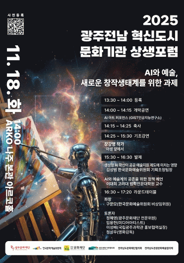 ±¤ÁÖ¹®ÈÀç´Ü(Á÷¹«´ëÇà ÀüÀº¿Á)°ú Çѱ¹¹®È¿¹¼úÀ§¿øÈ¸(À§¿øÀå Á¤º´±¹), Àü³²¹®ÈÀç´Ü(´ëÇ¥ÀÌ»ç ±èÀº¿µ)Àº ¿À´Â 11¿ù 18ÀÏ Çѱ¹¹®È¿¹¼úÀ§¿øÈ¸ ³ªÁÖ º»°ü ¾Æ¸£ÄÚȦ¿¡¼ 'AI¿Í ¿¹¼ú, »õ·Î¿î âÀÛ»ýŰ踦 À§ÇÑ °úÁ¦'¸¦ ÁÖÁ¦·Î ±¤ÁÖÀü³² Çõ½Åµµ½Ã ¹®È±â°ü »ó»ýÆ÷·³À» °øµ¿ °³ÃÖÇÑ´Ù.