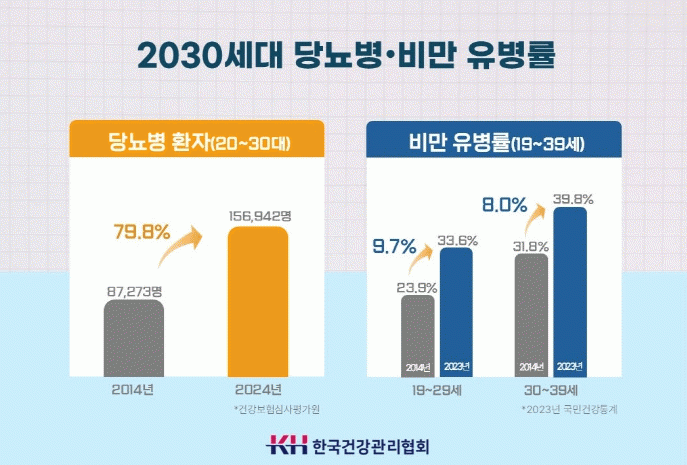 ´ç´¢º´ Áõ°¡ÀÇ ¿øÀÎÀº ºÒ±ÔÄ¢ÇÑ ½Ä½À°ü, ¿îµ¿ ºÎÁ·, °úµµÇÑ ½ºÆ®·¹½º¿Í À½ÁÖ µîÀ¸·Î ÀÎÇÑ ºñ¸¸ Áõ°¡¿Íµµ ¹ÐÁ¢ÇÑ °ü·ÃÀÌ ÀÖ´Â °ÍÀ¸·Î ¾Ë·ÁÁ® ÀÖ´Ù. 20~30´ëÀÇ ´ç´¢º´ À¯º´·ü Áõ°¡ ¿ª½Ã ÀÌ¿Í ¹«°üÇÏÁö ¾Ê´Ù. ½ÇÁ¦ 20~30´ëÀÇ °æ¿ì 10³â Àü¿¡ ºñÇØ ºñ¸¸ À¯º´·üÀÌ ´Ù¸¥ ¿¬·É´ë¿¡ ºñÇØ Å©°Ô »ó½ÂÇß´Ù. ¡®2023³â ±¹¹Î°Ç°Åë°è¡¯¿¡ µû¸£¸é 2014³â 19~29¼¼ ºñ¸¸À²Àº 23.9%¿´À¸³ª 2023³â¿¡´Â 33.6%·Î »ó½ÂÇß´Ù. 30~39¼¼ÀÇ °æ¿ìµµ 31.8/%¿¡¼ 39.8%·Î »ó½ÂÇÏ¸ç ´Ù¸¥ ¿¬·É´ëº¸´Ù ³ôÀº Áõ°¡¼¼¸¦ º¸¿´´Ù.