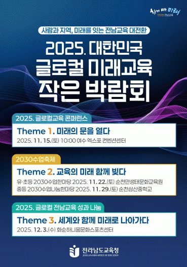 ¡®Áö¿ª°ú ¼¼°è¸¦ ÀÕ´Â ±Û·ÎÄà Àü³²±³À°À¸·Î ¹Ì·¡±³À°À» µðÀÚÀÎÇÏ´Ù¡¯¸¦ ÁÖÁ¦·Î ÇÑ À̹ø ¹Ú¶÷ȸ´Â Áö³ÇØ ¿©¼ö¿¡¼ ¼º°øÀûÀ¸·Î °³ÃÖÇÑ ¡®2024 ´ëÇѹα¹ ±Û·ÎÄà ¹Ì·¡±³À°¹Ú¶÷ȸ¡¯ÀÇ ¼º°ú¸¦ °è½ÂÇϱâ À§ÇØ ±âȹµÆ´Ù. ¹Ú¶÷ȸ´Â Çб³¡¤Áö¿ª¡¤±³À°°øµ¿Ã¼°¡ ÇÔ²² ¸¸µé¾î ¿Â Àü³²Çü ¹Ì·¡±³À°ÀÇ ¼º°ú¸¦ ³ª´©°í Áö¼Ó °¡´ÉÇÑ ±³À° ¹ßÀü ¹æÇâÀ» ¸ð»öÇÏ´Â ÀåÀÌ µÉ Àü¸ÁÀÌ´Ù.